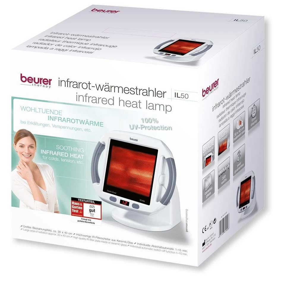Deze Beurer IL 50 infrarood warmtestraler vermindert spierklachten en verkoudheid d.m.v. het uitstralen van diepwerkende infrarood warmte. Deze infrarood warmtestraler beschikt over automatische uitschakeling. Tijdinstellingen tot 15 minuten mogelijk. Deze warmtestraler beschikt over een groot stralingsoppervlak en heeft een verstelbaar kantelmechanisme.