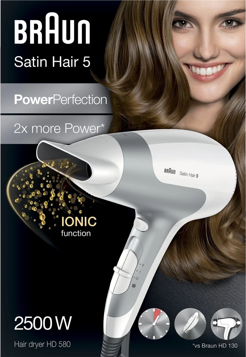 Ultrakrachtige haardroger van Braun HD 580. De kracht van snelle, moeiteloze schoonheid. Zo krachtig dat je niet zal geloven hoe compact en licht hij is. Met de 2500 watt van de Braun Satin Hair PowerPerfection haardroger heb je nu alle kracht in handen om je haar goed, eenvoudig en vooral snel te drogen.