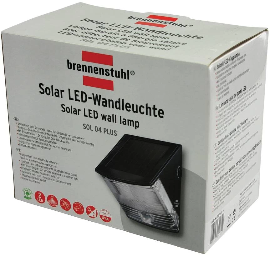 Voor universeel gebruik buiten, IP44. Compacte zonnecellamp met ingebouwde zonnecel en infraroodbewegingsmelder. Detectiehoek ca. 100 °, reikwijdte max. 7 M. Tijdspanne van licht ca. 1 minuut na laatste beweging. Onafhankelijk van het stroomnet. Met schemeringssensor. Compacte zonnecellamp met geïntegreerde zonnecel, geen kabels nodig. Met 2 uiterst felle LED’s voor goed oriënteringslicht.