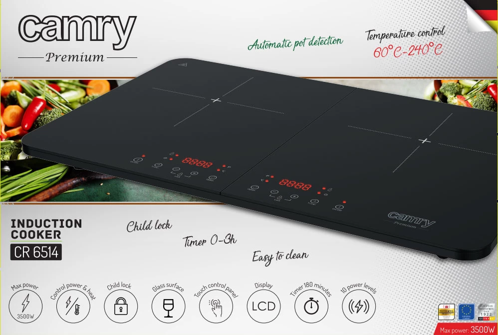 Een inductiekookplaat met twee pitten en een LCD-display is een noodzakelijke keukenuitrusting. Het kan worden gebruikt voor het opwarmen of bereiden van maaltijden die het gelijktijdige gebruik van twee potten of pannen vereisen. Het fornuis CR 6514 kan worden gebruikt als noodoptie wanneer het hoofdfornuis niet beschikbaar is, maar kan ook een vaste plaats krijgen in een vakantiehuisje of zelfs een keuken. Met de oven kunt u het verwarmingsvermogen op twee manieren instellen, door de gewenste temperatuur of het gewenste vermogen in te stellen. Hij heeft ook de functies verwarmen en snelkoken. Hij is uitgerust met twee verwarmingszones met een diameter van 220 mm en 10 verwarmingsniveaus. Het fornuis heeft kindveilige opties.