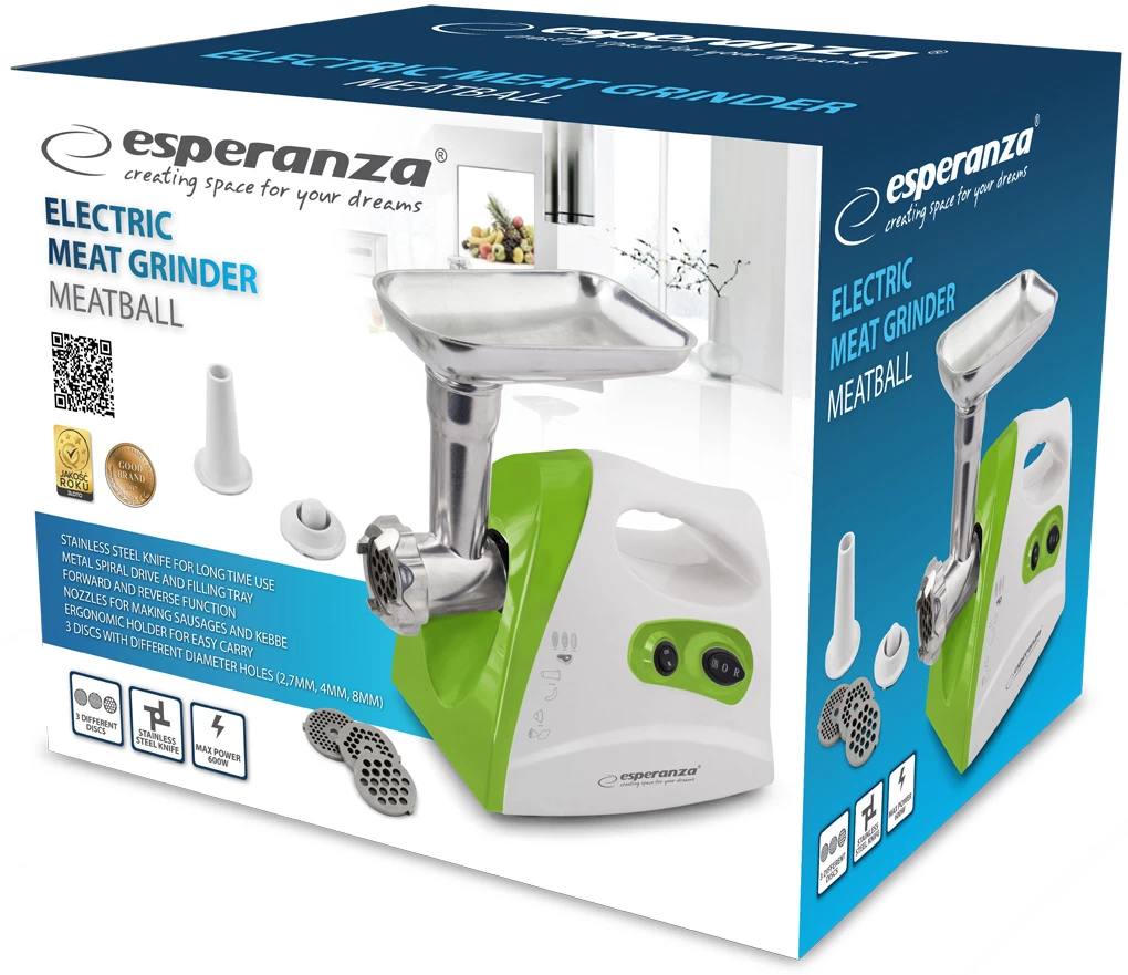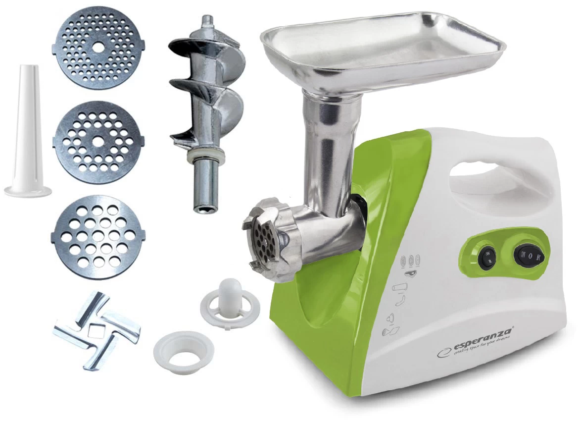 De Esperanza EKM012G vleesmolen is een modern en functioneel apparaat dat in elke keuken moet worden gebruikt. De drie schijven met gaten met verschillende diameters (2,7 mm, 4 mm, 8 mm) malen niet alleen vlees maar ook andere voedingsmiddelen.
