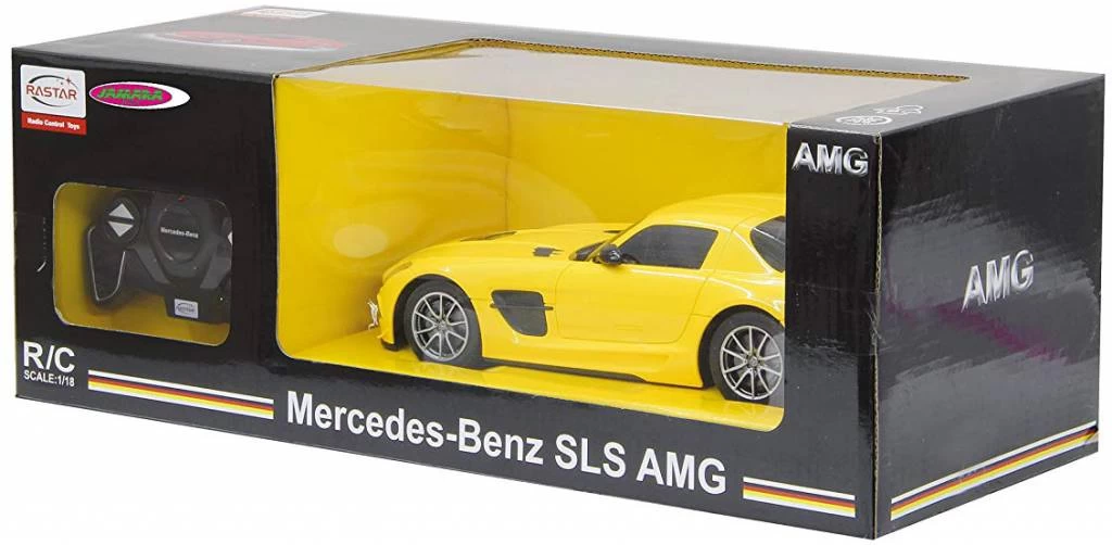 Dit is de radiografisch bestuurbare Jamara Mercedes-Benz SLS AMG 1:18 in de kleur geel.