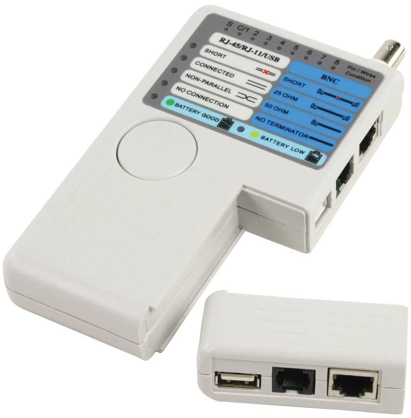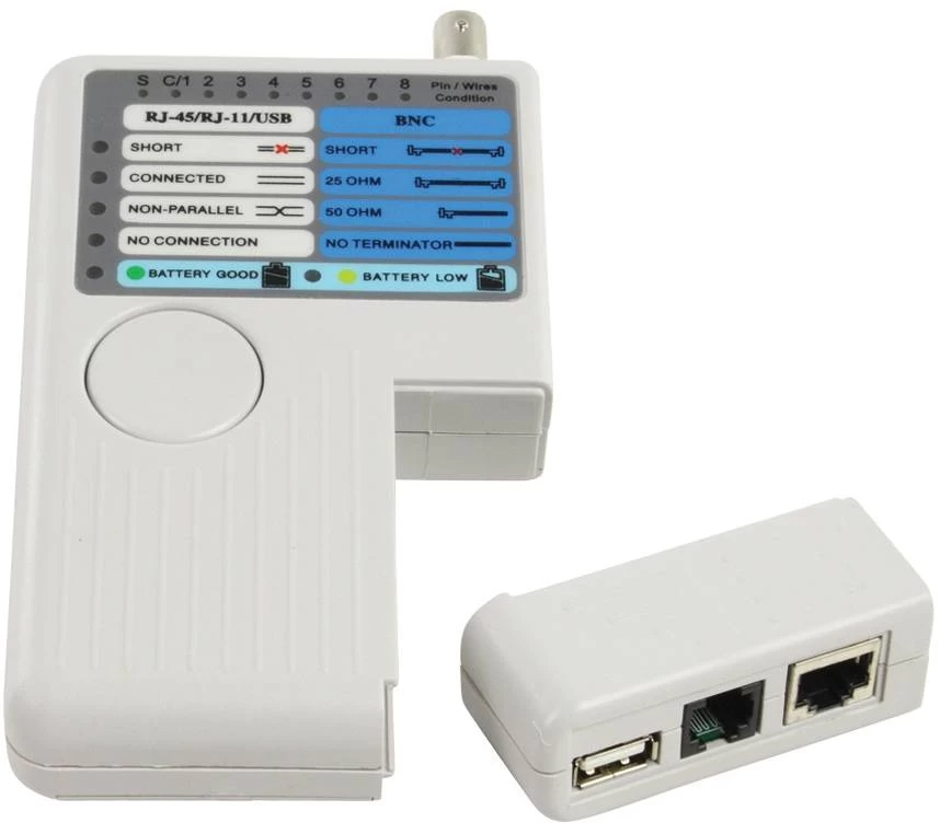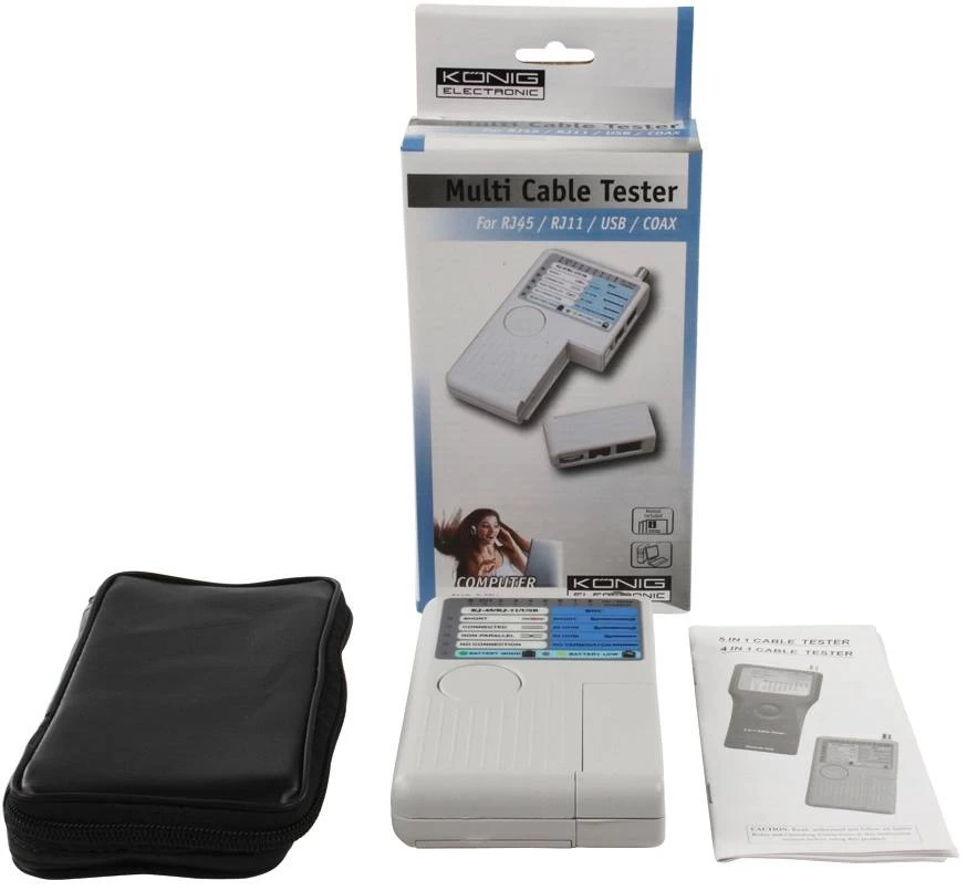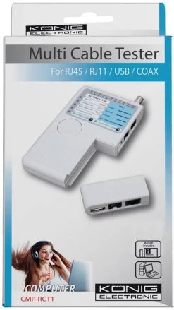De tester is geschikt voor RJ45, RJ11, USB en coax (BNC).