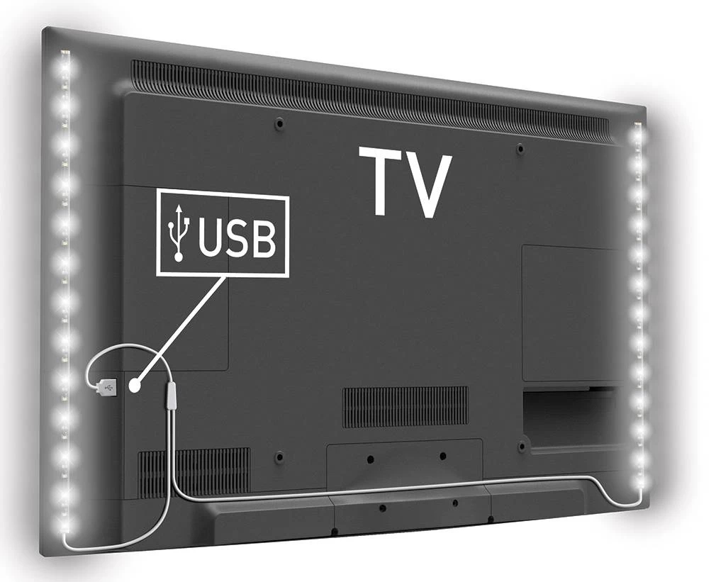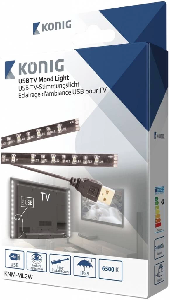 Zorg voor koel witte sfeerverlichting in uw huiskamer met de Konig USB LED TV-Strip 50 CM. Plak TV-strip achter de tv om vermoeide ogen te voorkomen en de kijkervaring te verbeteren. Tv kijken in een donkere kamer kan zorgen voor vermoeide ogen doordat de oogspieren continu samentrekken en ontspannen door het grote lichtverschil tussen de donkere omgeving en het TV-scherm. Normale kamerverlichting vermindert echter weer de kijkervaring. De LED TV-strip lost al deze problemen voor u op, de TV bevat een mooi lichteffect dat niet reflecteert in het scherm. Hij bestaat uit twee lichtstrips die aan één USB-stroomkabel zijn verbonden, voor ruime bevestigingsmogelijkheden.