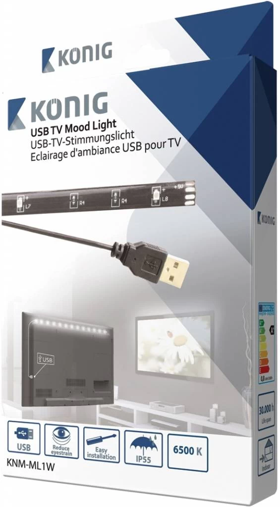 Zorg voor koel witte sfeerverlichting in uw huiskamer met de Konig USB LED TV-Strip 90 CM. Plak TV-strip achter de tv om vermoeide ogen te voorkomen en de kijkervaring te verbeteren. Tv kijken in een donkere kamer kan zorgen voor vermoeide ogen doordat de oogspieren continu samentrekken en ontspannen door het grote lichtverschil tussen de donkere omgeving en het TV-scherm. Normale kamerverlichting vermindert echter weer de kijkervaring. De LED TV-strip lost al deze problemen voor u op, de TV bevat een mooi lichteffect dat niet reflecteert in het scherm. Hij bestaat uit één lichtstrip die aan één USB-stroomkabel is verbonden, voor ruime bevestigingsmogelijkheden.