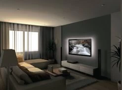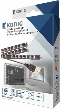 Mood light LED-strips om op een TV te plakken om vermoeide ogen te voorkomen en de kijkervaring te verbeteren. TV kijken in een donkere kamer kan vermoeide ogen tot gevolg hebben doordat de oogspieren continu samentrekken en ontspannen door het grote lichtverschil tussen de donkere omgeving en het TV-scherm. Normale kamerverlichting vermindert echter weer de kijkervaring. De mood light verlicht de TV met een koel, wit licht dat niet in het scherm reflecteert. Hierdoor worden alle problemen opgelost en tegelijkertijd past de mood light in ieder interieur. Hij bestaat uit drie dimbare lichtstrips die met één USB-stroomkabel zijn verbonden, voor vele bevestigingsmogelijkheden.