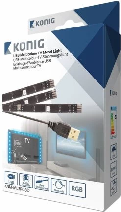 De mood light lost al deze problemen op en verlicht tegelijkertijd de TV met licht dat dimbaar is, een regelbare kleur heeft en niet in het scherm reflecteert. Hij bestaat uit drie dimbare lichtstrips die met één USB-stroomkabel zijn verbonden, voor vele bevestigingsmogelijkheden.