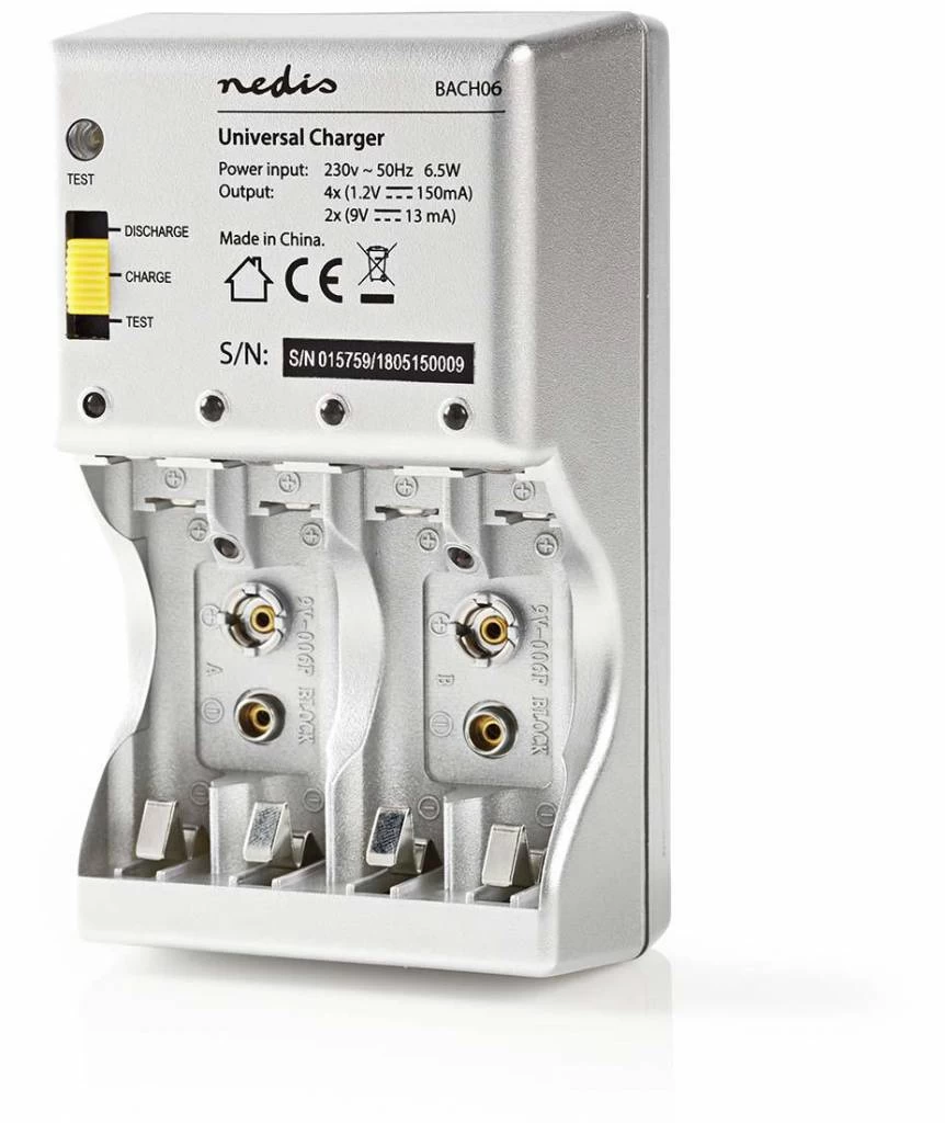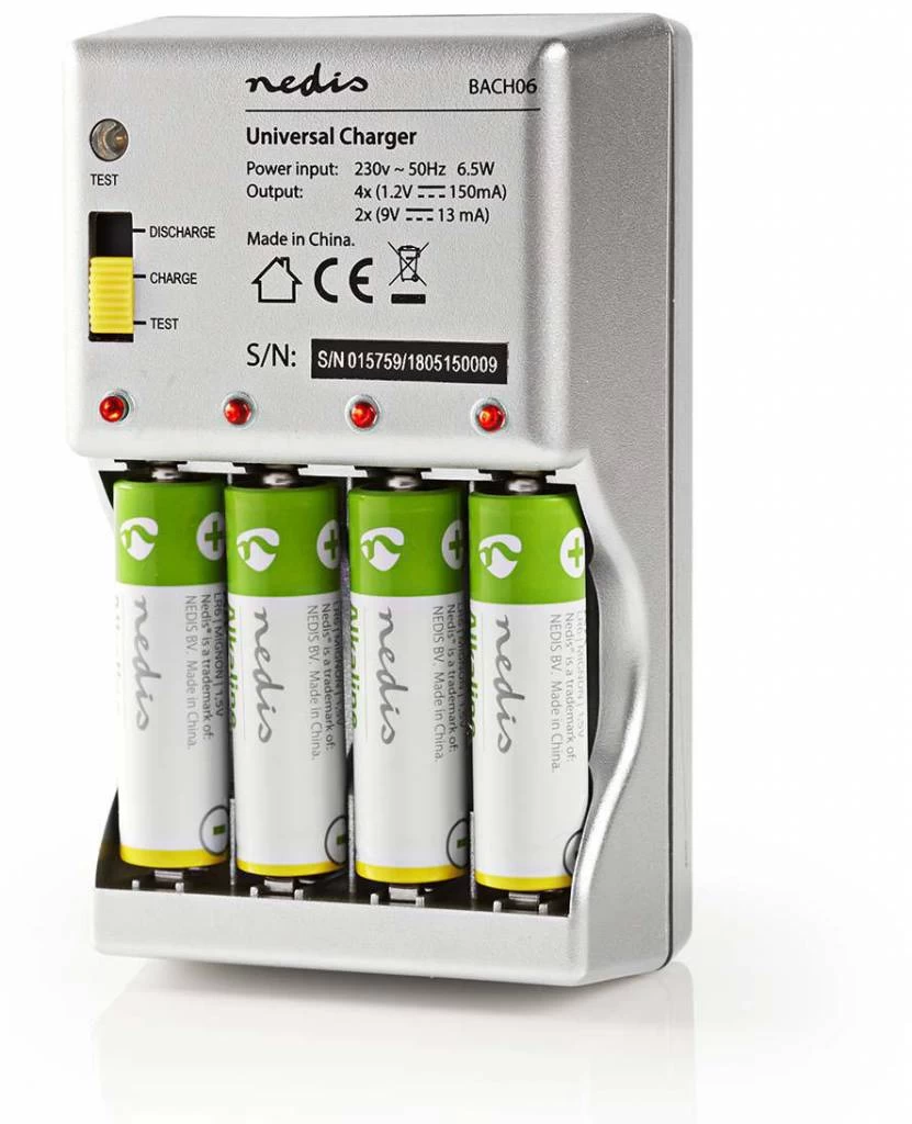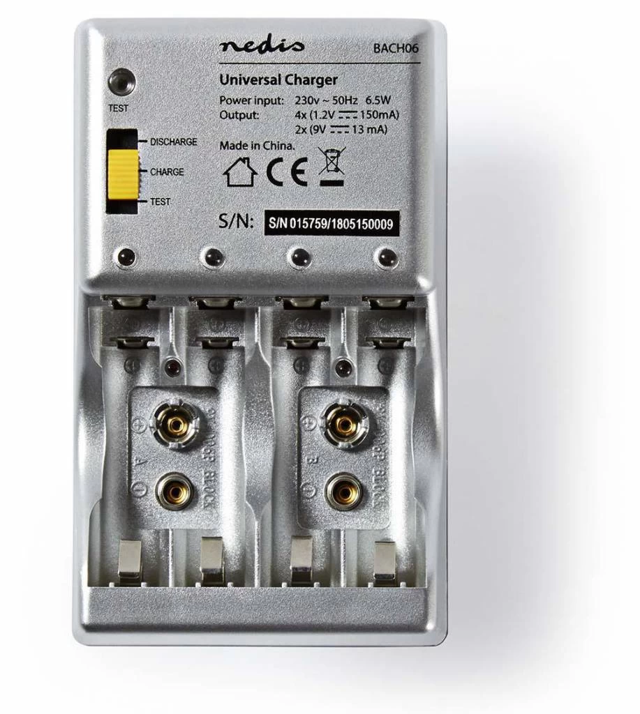 Deze universele batterij lader kan 1-4 AA / AAA batterijen (ont)laden en 1-2 9V blokbatterijen (alleen laadfunctie). De lader heeft ook een testfiunctie waarbij je met behulp van een schakelaar de conditie van de batterij kan meten
