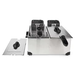 Geniet van je gefrituurde snacks met deze ruime frituurpan met roestvrijstalen behuizing en afneembaar deksel. Met zijn inhoud van 2x 3 liter is deze friteuse perfect voor een maaltijd met het hele gezin.