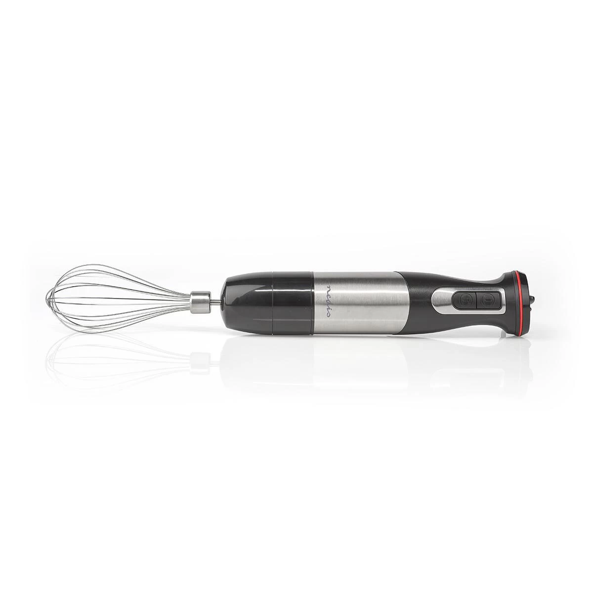 De moderne, roestvrij stalen afwerking voelt deze handblender zich thuis in elke keuken.