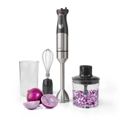 Maak je keuken compleet met deze compacte maar complete 4-in-1-mixerset, inclusief een staafmixer, een hakmolen om bijvoorbeeld bloemkoolrijst te maken, een garde om melk op te schuimen voor een cappuccino of om eieren te klutsen voor een omelet en een handige kan om in te mixen of om je gemengde lekkernijen in te schenken. Soep, sauzen en smoothies mengen was nog nooit zo eenvoudig.