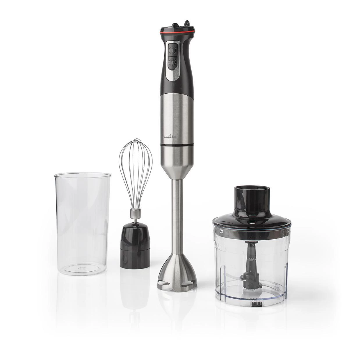 Bij deze Nedis 4-in-1 mixerset is een ruime kan van 900 ml inbegrepen. Gebruik de staafmixer om direct in de kan te mixen, zodat je gelijk de juiste hoeveelheid van het ingrediënt hebt. De hakmolen van 500 ml is ideaal voor het fijnhakken van uien, noten en bloemkool, terwijl de staafmixer uitermate geschikt is voor het maken van gladde soepen, vruchtensappen voor baby’s en smoothies.