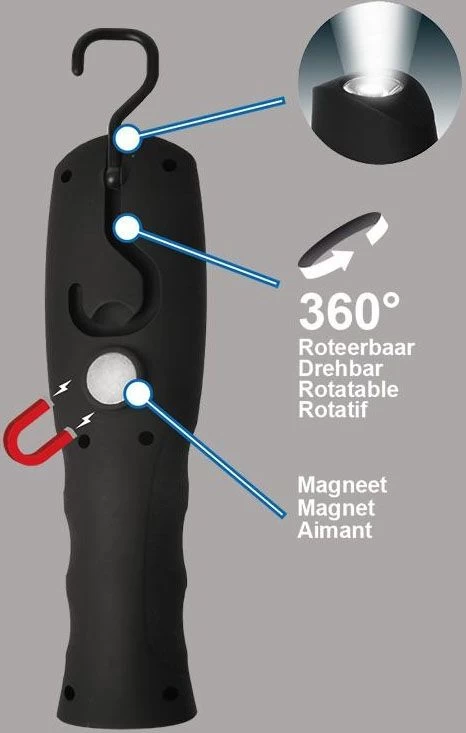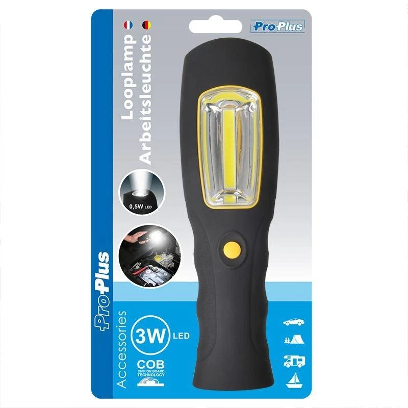 Deze fijne werklamp van ProPlus bevat 3 W COB LED en 0,5 W LED licht aan de bovenzijde van de lamp. Een licht in gewicht en eenvoudige looplamp voor in gebruik. Zeer ideaal en geschikt voor in de auto, op de boot, werkplaats, kamperen, vissen, etc. De lamp bevat een magneet bevestiging en een eenvoudig en snel uit te klappen haak aan de achterzijde. Deze haak is 360º roteerbaar, zeer handig als u snel ergens verlichting nodig hebt.