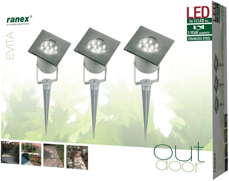 Deze set bevat drie grondspots van het merk Ranex van het type Evita. Elke grondspot bevat 12 LED’s met een vermogen van 36 x 0.06 W en 12 V. De set is van geborsteld RVS en hebben een pin voor om te bevestigen. Hiermee kunt u deze makkelijk in de aarde bevestigen. U verlicht uw tuin met deze mooie LED lampen en het maakt u exterieur compleet. Natuurlijk is het ook mogelijk om in eerste instantie slechts één LED grondspot in grijs te gebruiken, zodat je nog twee reservestuks in huis hebt!