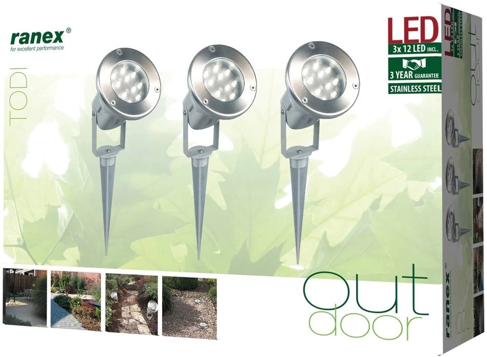 Deze set bevat drie grondspots van het merk Ranex van het type Todi. Elke grondspot bevat 12 LED’s met een vermogen van 0.06 W en 12 V. De set is van geborsteld staal en hebben een pin voor om te bevestigen. Hiermee kunt u deze makkelijk in de aarde bevestigen.