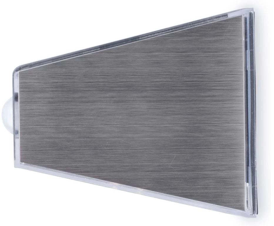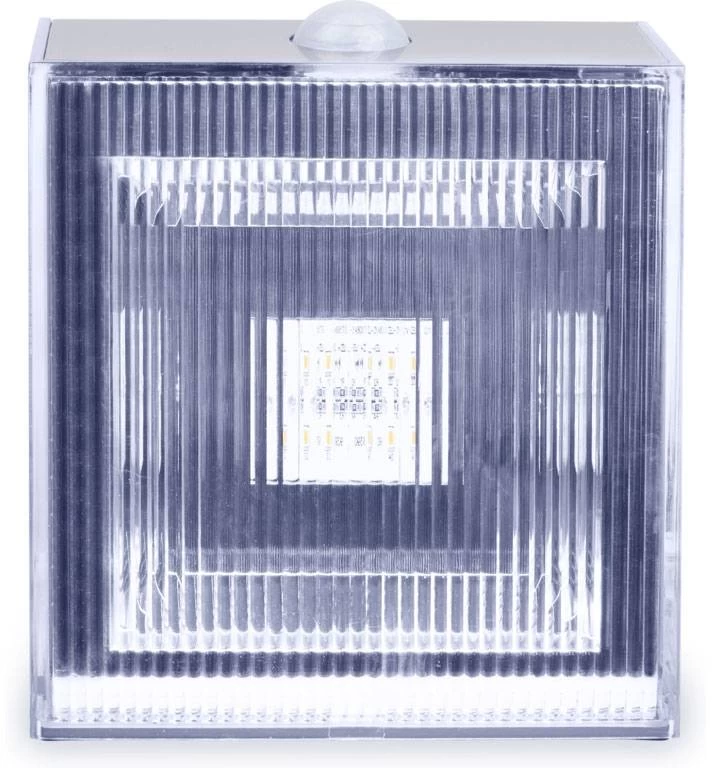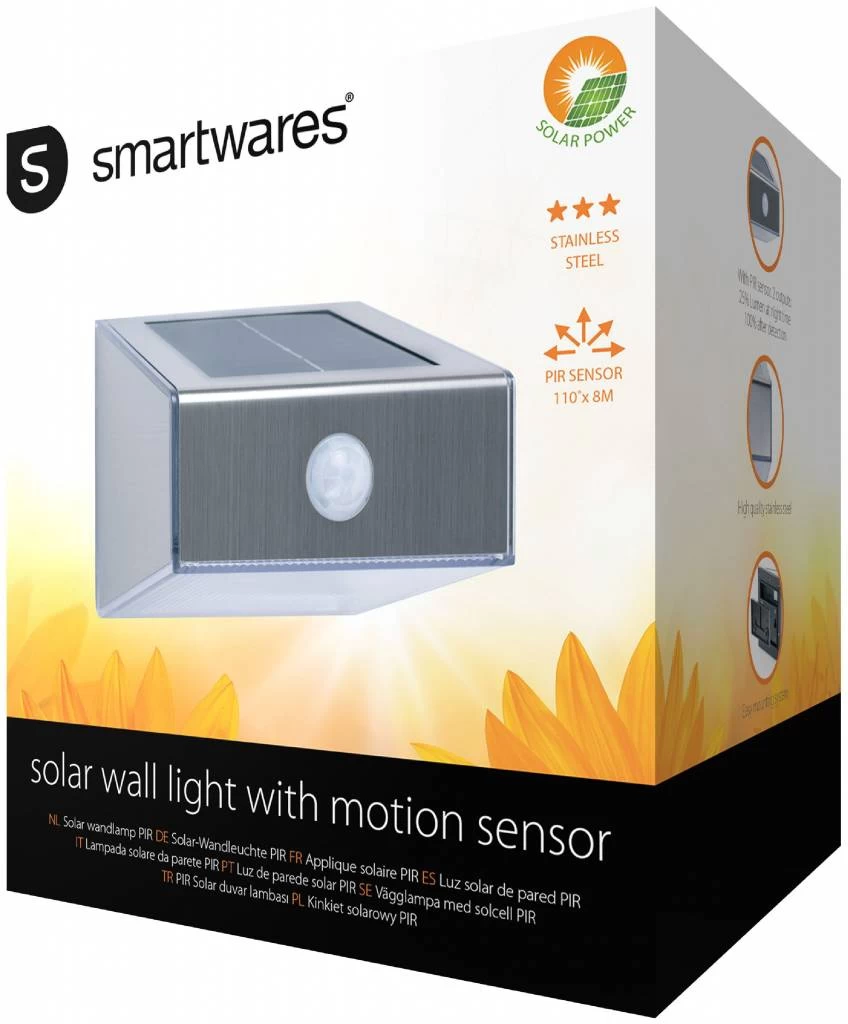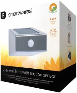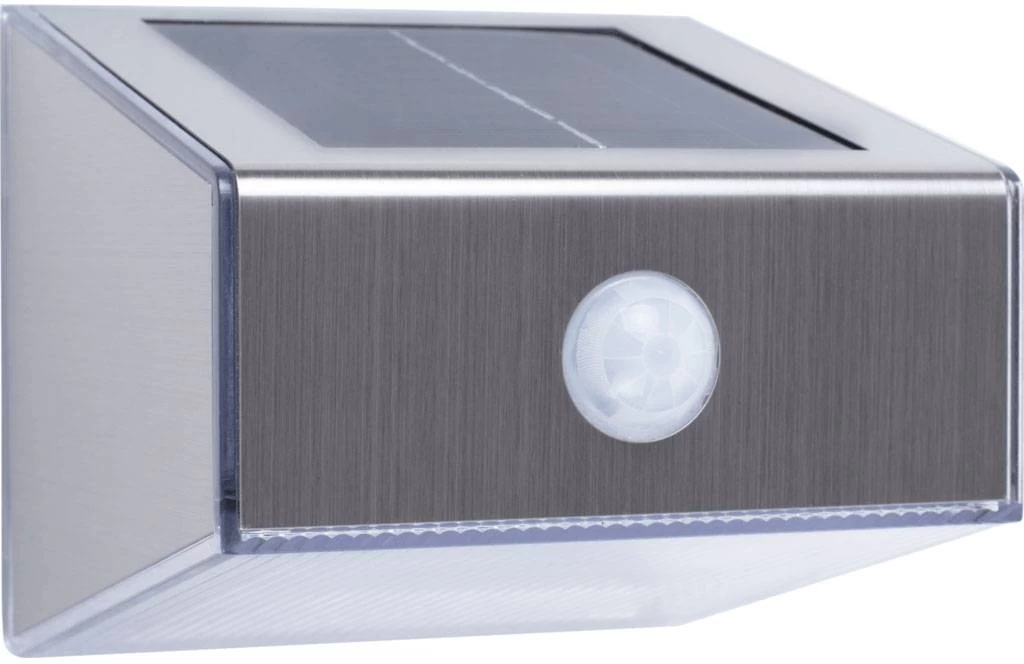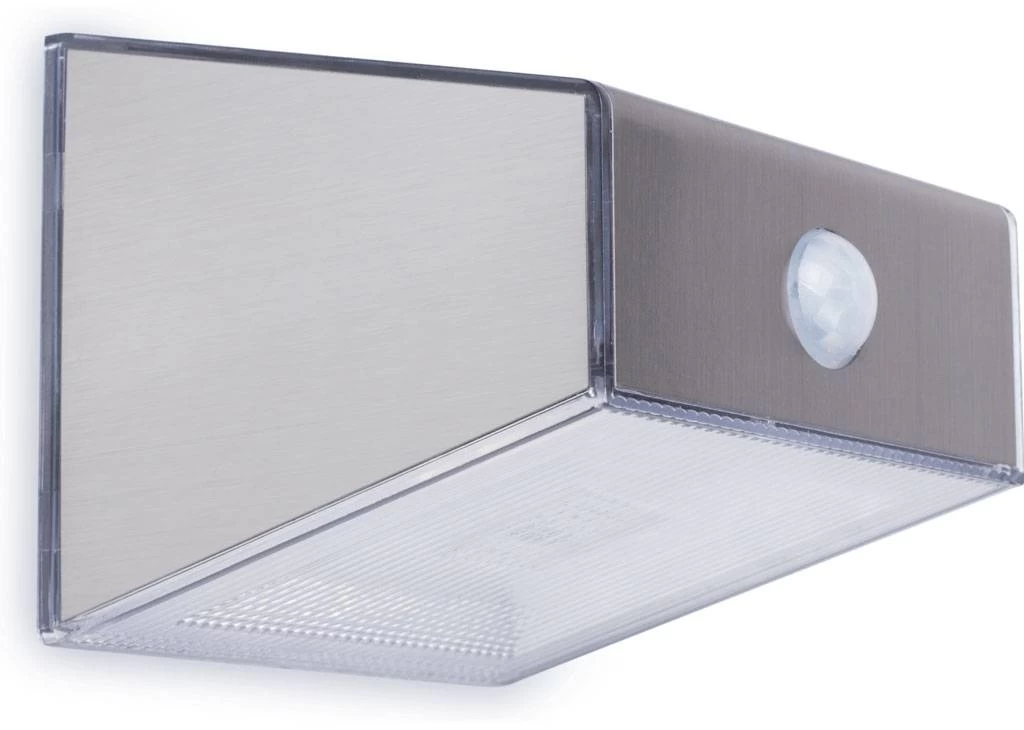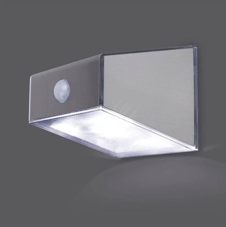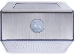 Deze wandlamp op zonne-energie is gemaakt van roestvrijstaal en voorzien van een bewegingsmelder. Deze lamp gaat zacht (15 lumen) constant branden zodra de duisternis invalt, maar bij detectie van beweging zal de lamp feller gaan branden (75 lumen) Dit model is enkel geschikt om naar beneden te schijnen.