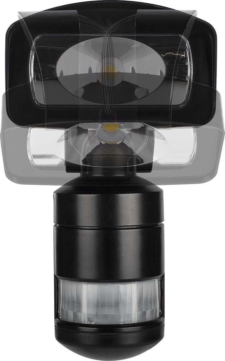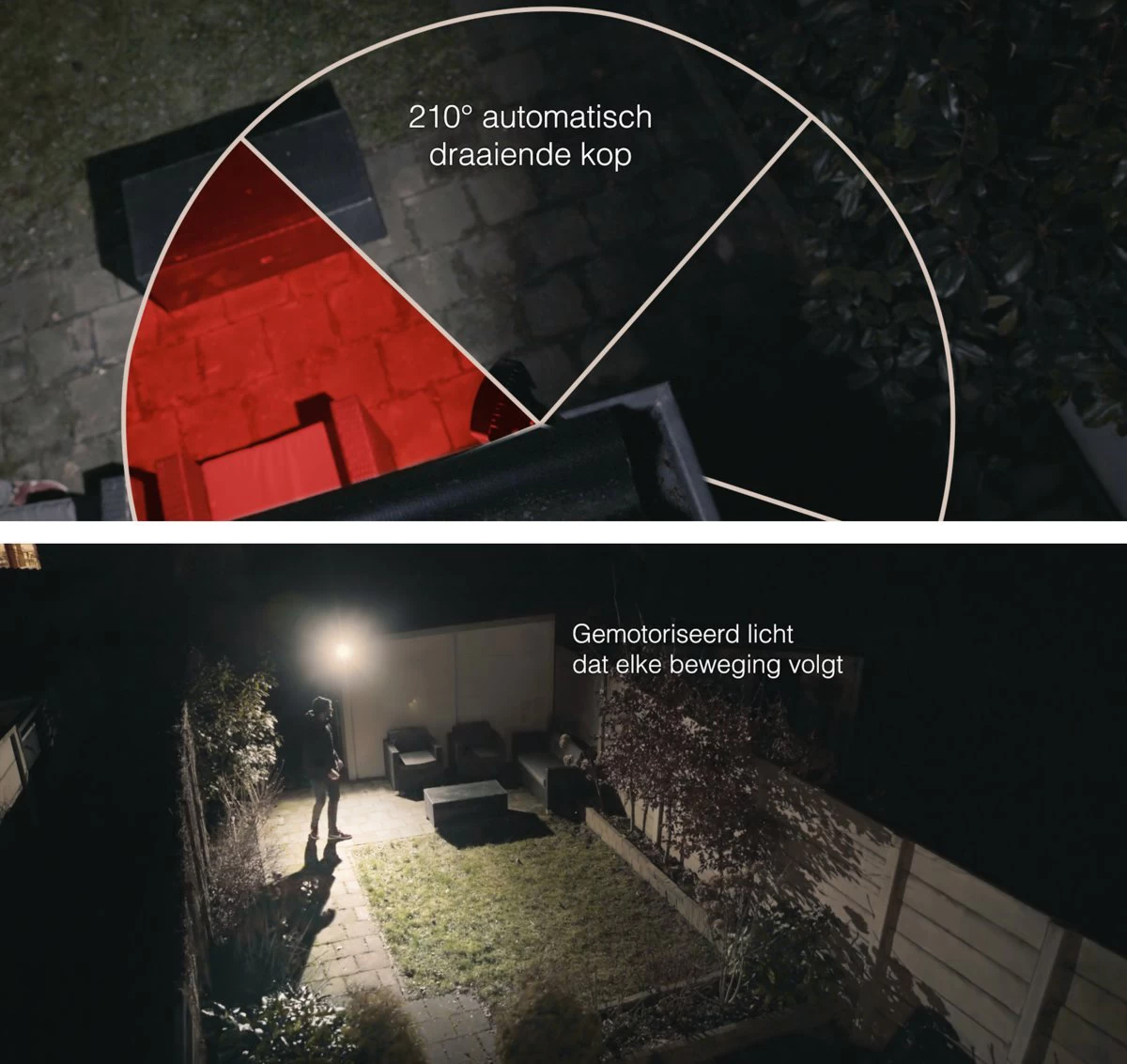 De floodlight heeft een unieke draaibare kop die op basis van beweging meedraait. De lamp is uitgevoerd met 3 sensoren waardoor de lamp een uniek groot bereik heeft van 210 graden x 10 meter. Als ongewenste gasten eenmaal het grote detectiegebied betreden dan zal de lamp ze blijven volgen totdat ze weer weggaan. De koplamp is kantelbaar en daardoor te richten in de juiste hoek. De lamp blijft ongeveer 3 minuten branden na het detecteren van beweging.