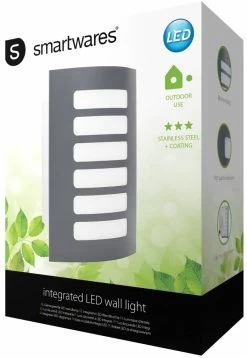 Deze LED geïntegreerde buiten wandlamp (IP44) is gemaakt van roestvrijstaal in een donker grijze kleur. De lamp geeft mooi warm licht. Deze compacte wandlamp met geïntegreerde LED’s is met 20 x 15 cm een subtiele toevoeging aan uw gevel of schutting.