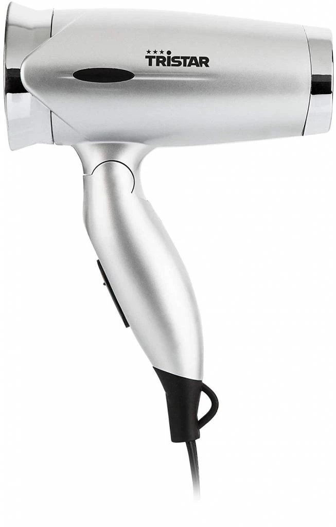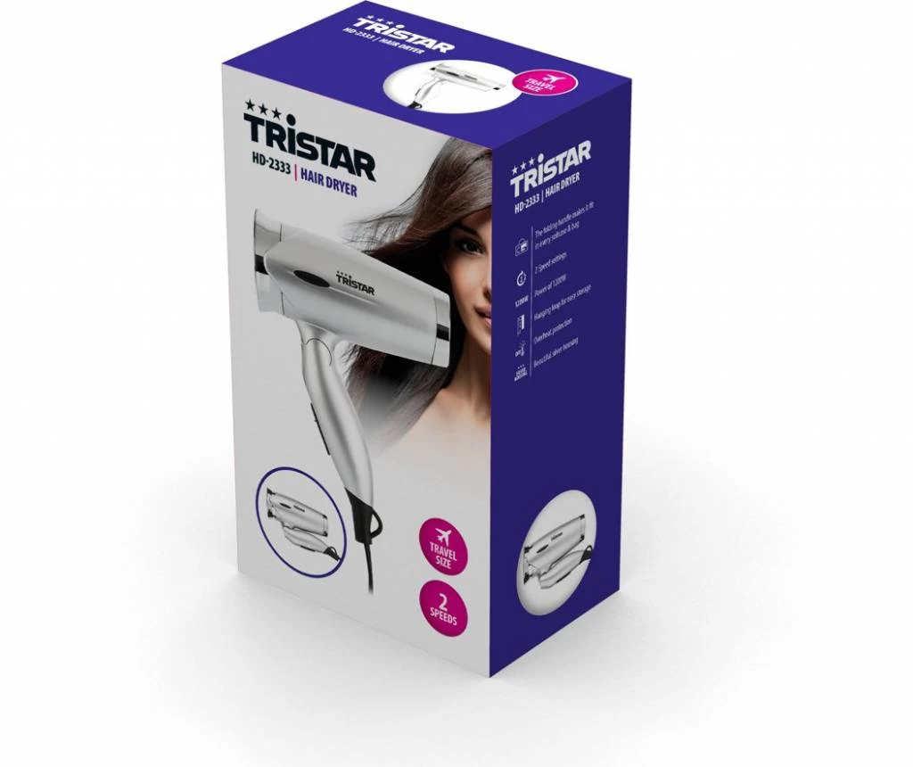 Compacte HD-2333 haardroger van Tristar 1200 W die door zijn inklapbare handvat ideaal is voor op reis.
